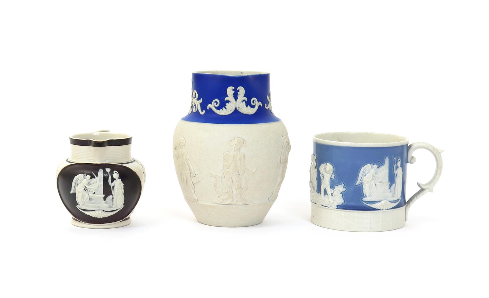 Two dry-bodied stoneware jugs early 19th century, the larger sprigged with a standing portrait of Nelson, flanked by four Classical figures, the neck with foliate sprays on a blue ground, the smaller with a brown glazed roundel applied with Britannia and an angel standing before an obelisk and inscribing a plaque with the names Howe and Nelson, and a small mug with the same application beside four putti with a goat, and doves on a birdbath, minor faults, 13cm max. (3)