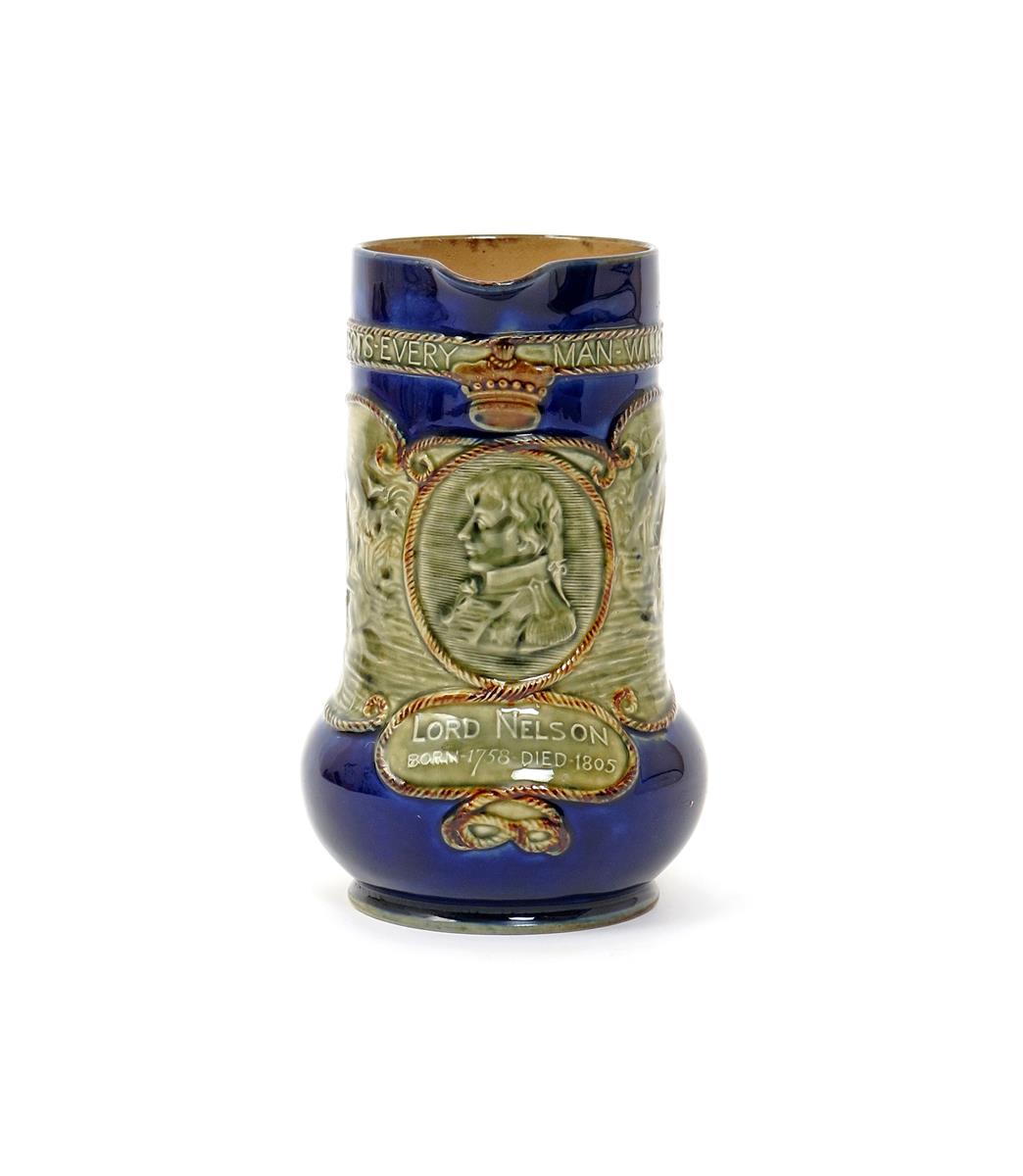 A Royal Doulton stoneware commemorative jug c.1905, moulded in shallow relief with a profile portrait of Lord Nelson against a naval battle scene, above his dates and below the inscription 'England Expects Every Man Will Do His Duty', applied with a ropetwist handle, impressed mark, 19.8cm.