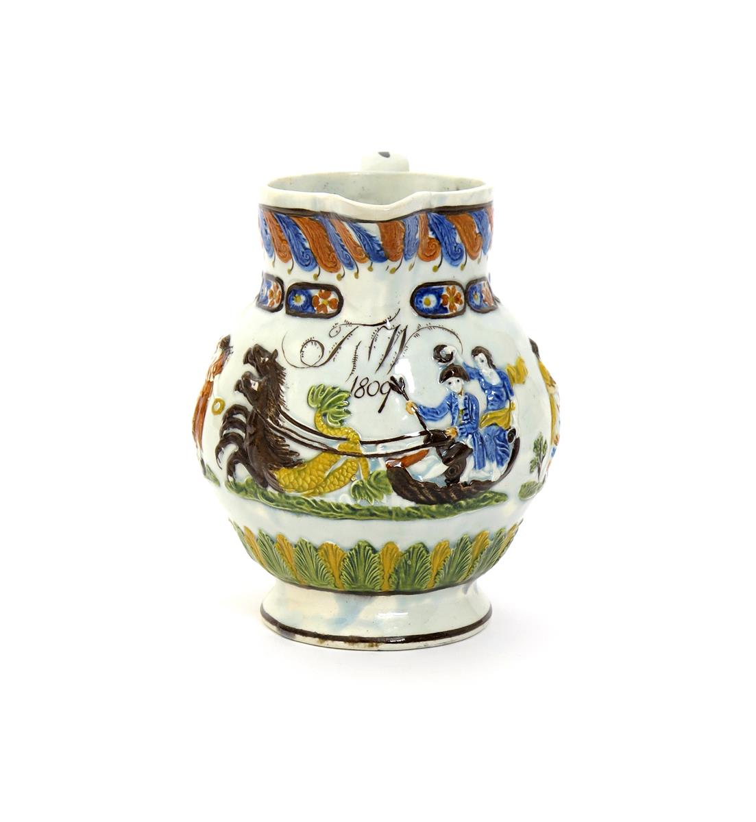 A rare Pratt ware commemorative jug dated 1809, moulded and coloured with a depiction of the apotheosis of Lord Nelson, the naval hero driving Neptune's chariot while a wreath is held over his head, the sides with Britannia and Fame, beneath the spout inscribed with the initials JW above the date 1809, restoration to the spout and handle, 15.5cm.
