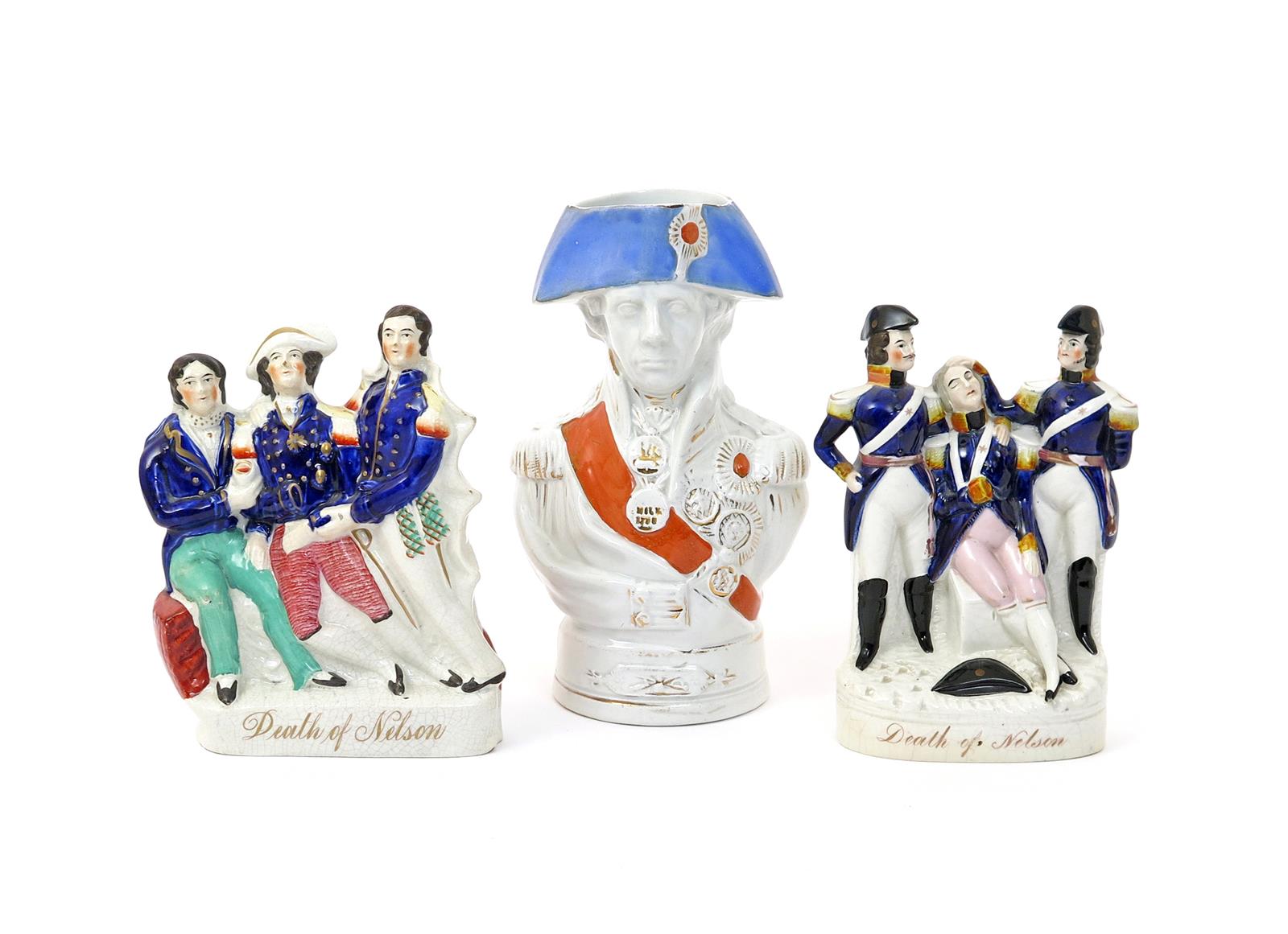 Two Staffordshire flatback figures of the Death of Nelson 19th century, the naval hero flanked in each case by two officers, wearing his hat in one group whilst bare-headed in another, the reverse of the former showing an outline of HMS Victory, together with a Staffordshire half-length portrait jug of Nelson in his Vice-Admiral's uniform, picked out in blue, red and gilt, minor faults, 26.4cm max. (3)