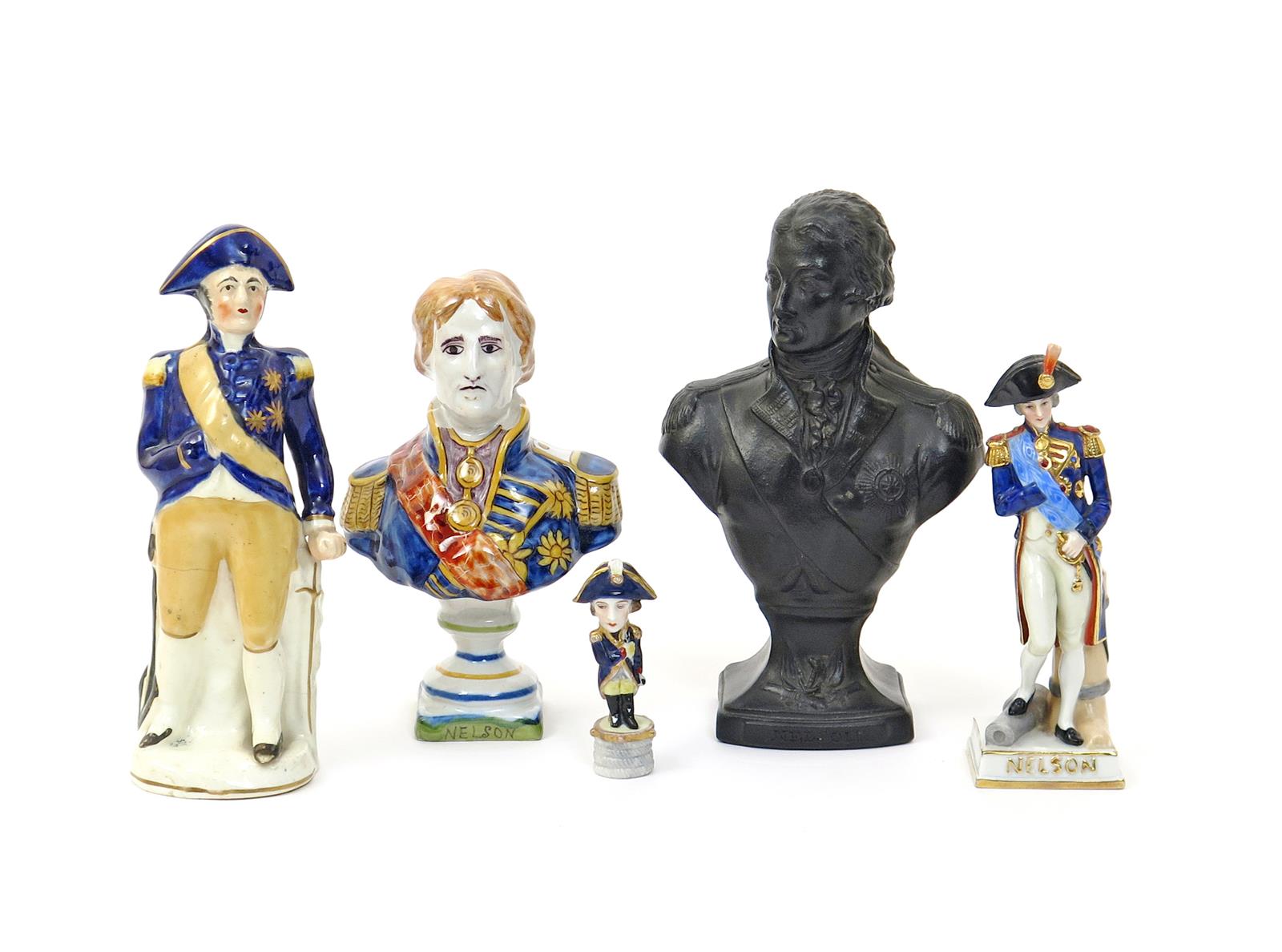 A black basalt portrait bust of Nelson 19th century, modelled with head turned to sinister and raised on a waisted square base moulded with military motifs, together with a Continental faïence bust of Nelson, a Staffordshire porcelain figure and two Continental porcelain figures of Nelson, all modelled standing and wearing his Vice-Admiral's uniform, 19cm max. (5)
