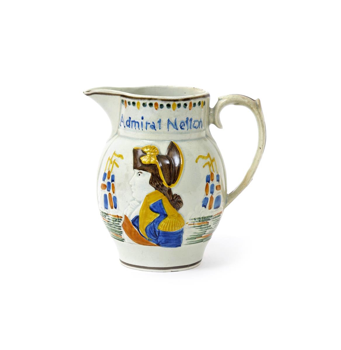 A small Pratt ware commemorative jug late 18th/early 19th century, one side crisply moulded and coloured with a profile portrait titled 'Admiral Nelson', the reverse with a similar portrait of Captain Berry, each flanked by two ships, some restoration, 15.6cm.