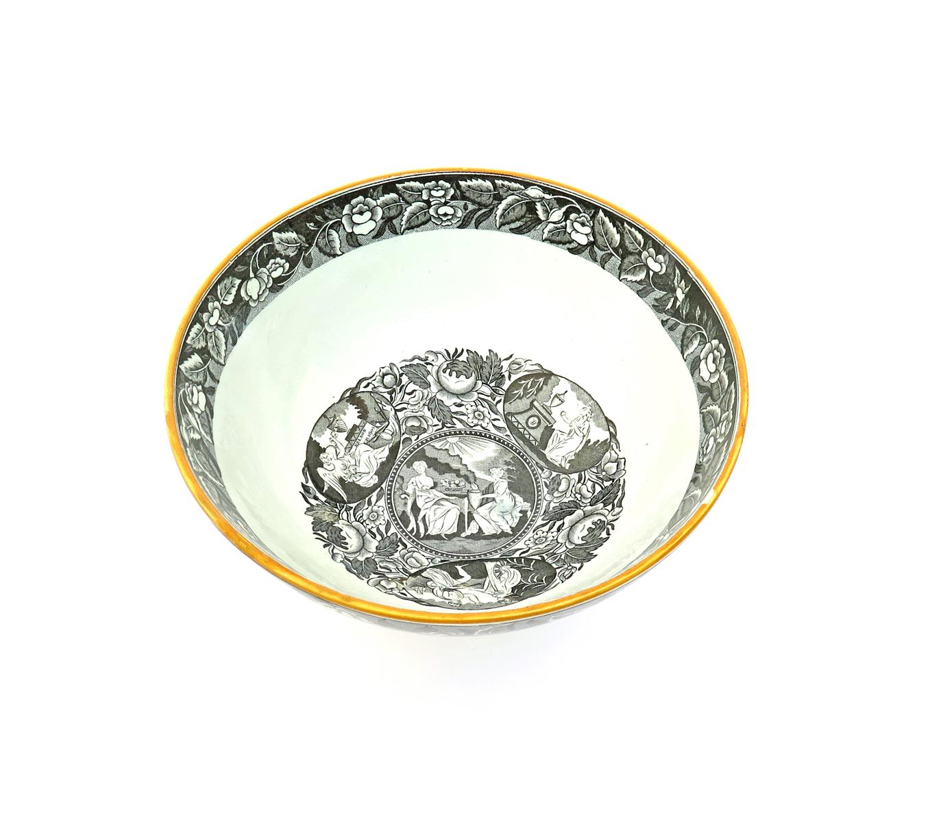 A pearlware commemorative footed bowl 1st half 19th century, depicting the mourning of Lord Nelson, the interior well printed in black with panels containing Neptune presenting a trident to Britannia, and two with figures at the grave of Nelson, the exterior with a continuous band of peony, 23.7cm.