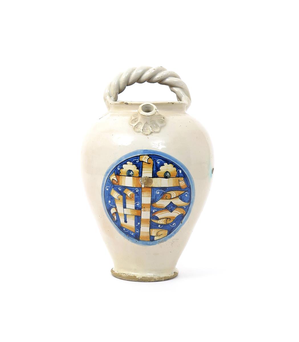A large Montelupo syrup or wet drug jar 18th century, the ovoid body painted with a large YHS monogram in shades of ochre on a blue ground within an oval panel, a short spout above, with an overhead ropetwist handle, a few small chips, 37.5cm.