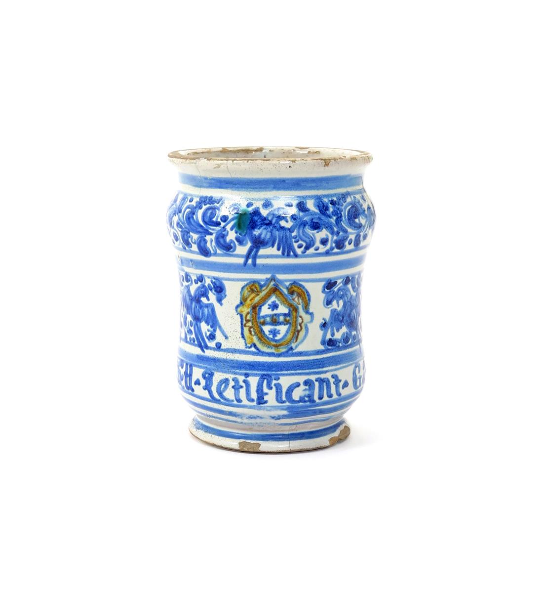A small Deruta maiolica albarello c.1670, of diminutive waisted form, painted with a small armorial shieldin blue, ochre and yellow, reserved between bands of birds in flight and foliate scrolls in blue, titled beneath with 'Letificant Galen', a faint tight rim crack, 12.7cm.