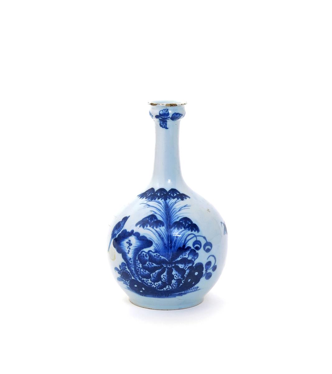 A Liverpool delftware guglet mid 18th century, the rounded body painted to two sides with a bird perched on rockwork beside bamboo and peony, the tapering neck rising to a swollen knop beneath the flared rim, painted with small leaf sprigs, a small amount of chipping to the rim, 23cm.