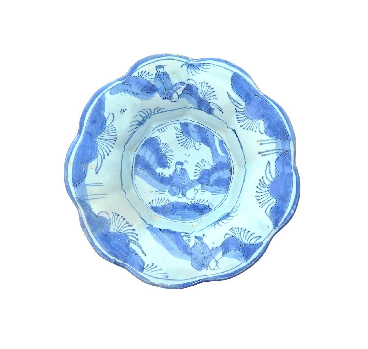 A delftware small lobed dish or cracknell c.1660-80, possibly London or Continental, painted in blue with a seated Chinaman amongst rockwork, the same design echoed twice to the lobed rim, raised on a low foot, 21.3cm.