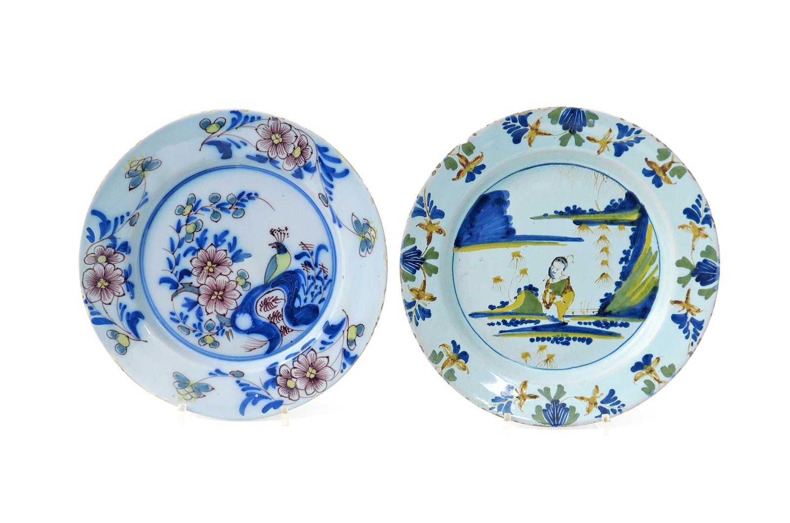 Two delftware plates c.1760-70, one Lambeth and painted in yellow, green, blue and ochre with a seated Chinese figure beside tall rockwork, the other Bristol and painted in blue, yellow, green and manganese with a peacock seated on holey rockwork beside flowering branches, a few filled rim chips to the latter, 22.3cm. (2)