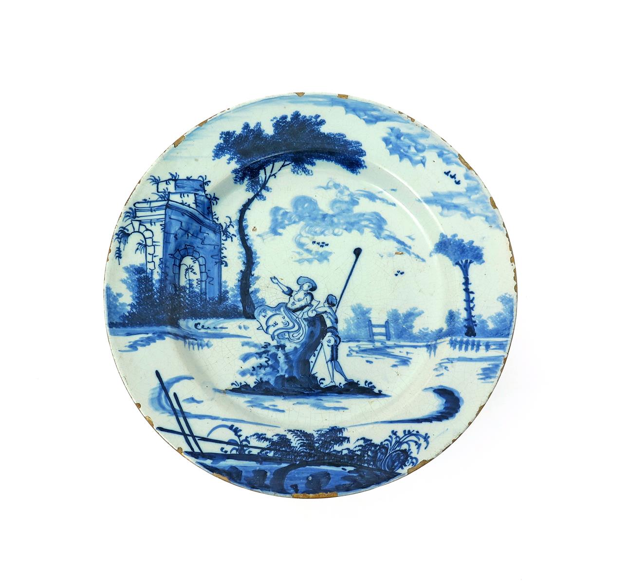 A London delftware charger c.1770, painted in blue with a maiden reclining on a rocky outcrop and attended by a young shepherd, beneath a tall sponged tree and before a ruined archway, small rim chips, 34cm.