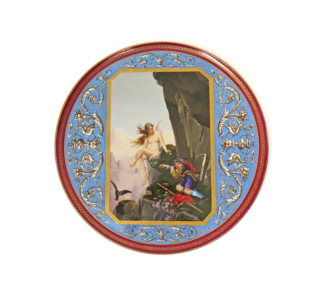 A massive Vienna-style circular tray 19th century, painted with The Spirit of the Alps after Konrad Dielitz, an Austrain traveller sleeping on a narrow mountain path and watched over by a winged maiden holding edelweiss flowers, within a wide border of mythical creatures and foliate scrolls on a pale blue ground, signed 'P Hoffmann' in gilt, titled in German to the reverse, blue shield mark, 50.5cm.