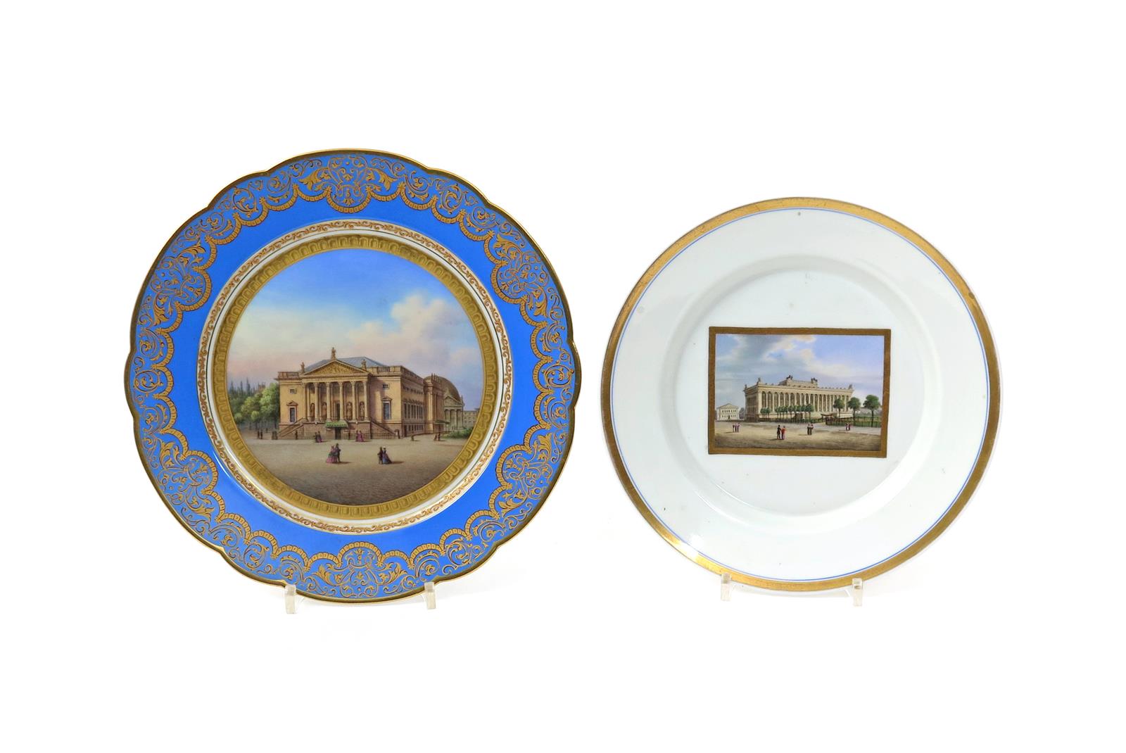 Two Berlin topographical plates 19th century, one painted with figures promenading before the Royal Opera House in Berlin, the rim with an elaborate gilt scroll design on a blue ground, the other with a rectangular panel painted with a view of Berlin's Old Museum, each titled in black to the underside, printed orb and sceptre marks, 24.3cm max. (2)