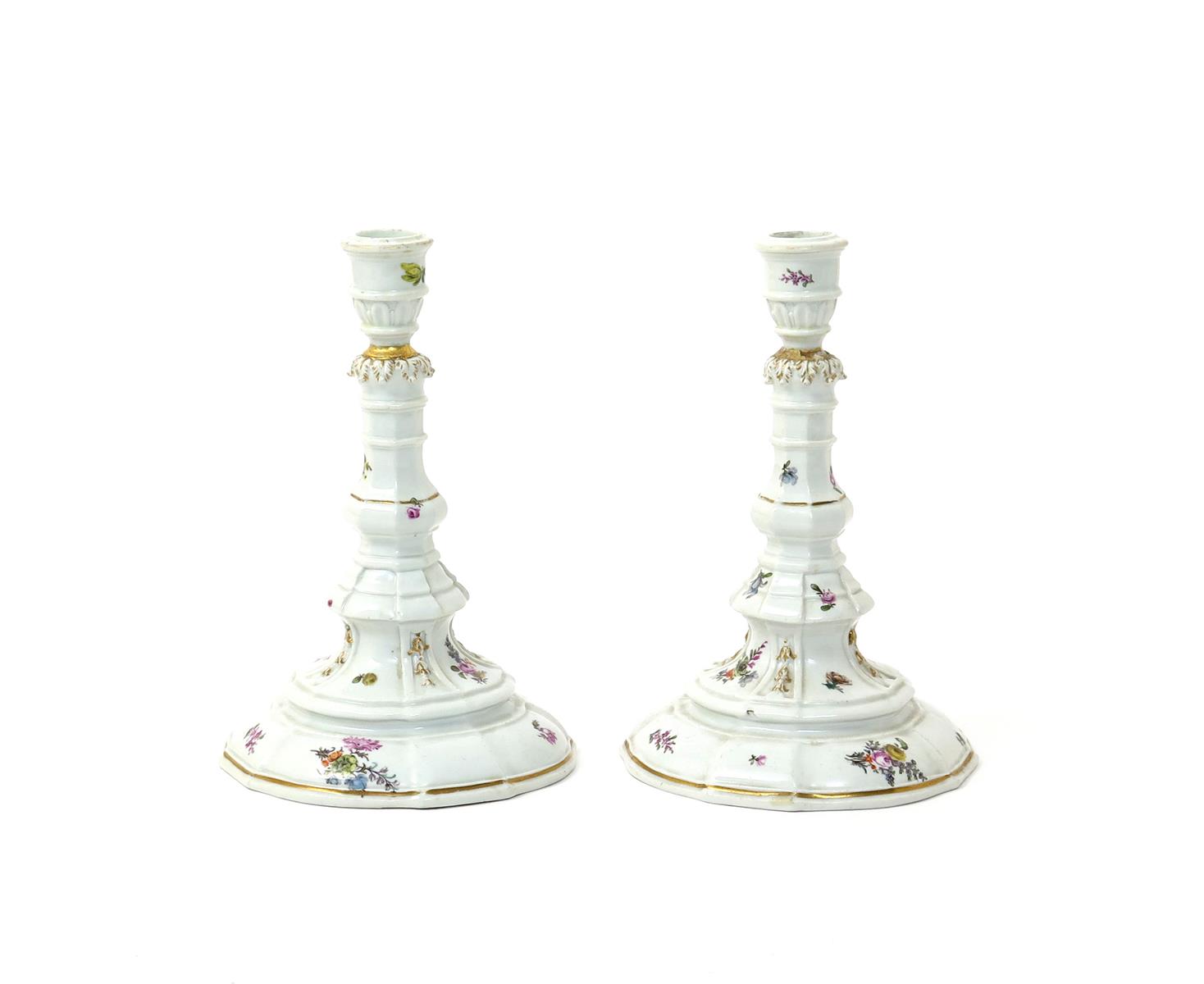 A pair of Meissen candlesticks mid 18th century, of faceted form, the moulded sconces raised on knopped stems above wide stepped feet, painted with small sprays of flowers and single scattered sprigs, applied with a band of gilded leaves around the top of each stem, blue crossed swords mark, one repaired through the neck, 23.5cm. (2)