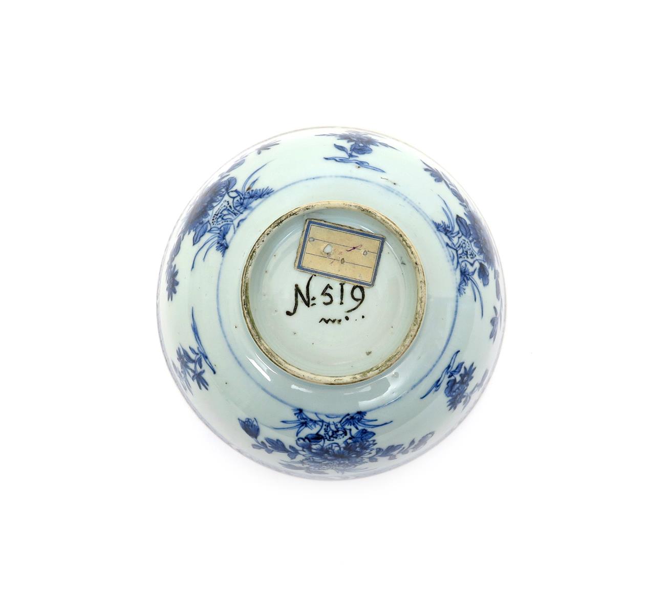 A Chinese blue and white porcelain bowl from the collection of Augustus the Strong Kangxi 1662-1722, painted to the exterior with sprays of chrysanthemum and other Oriental flowers, a similar spray to the well, incised and enamelled to the base with a Johanneum mark 'N:519', 14.7cm dia.