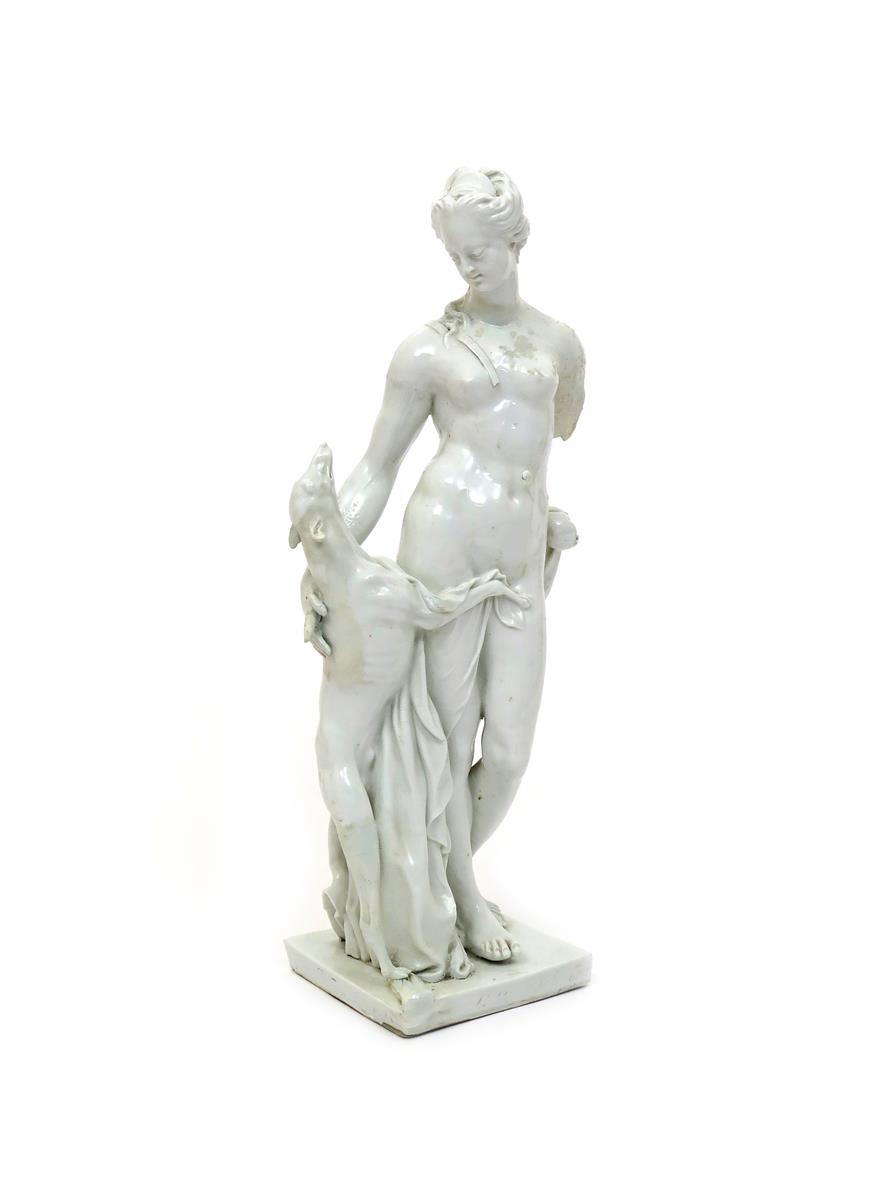 A large Nymphenburg figure of Diana c.1800, modelled by Joseph Anton Kirchmayer, standing and petting a greyhound to her right, raised on a low square base, impressed shield mark, damages, 43cm.