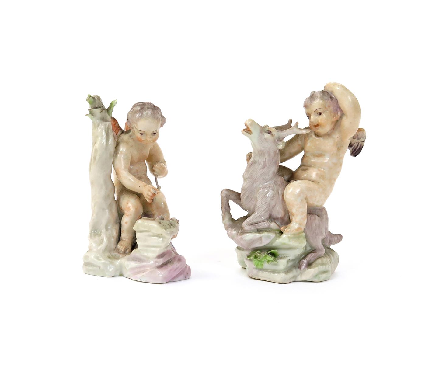 A pair of Continental figures of putti 18th century, Italian or French, one of a putto riding on the back of a stag, the other seated by a tree and a low stump, raised on rocky bases, some damages, 7.5cm. (2)