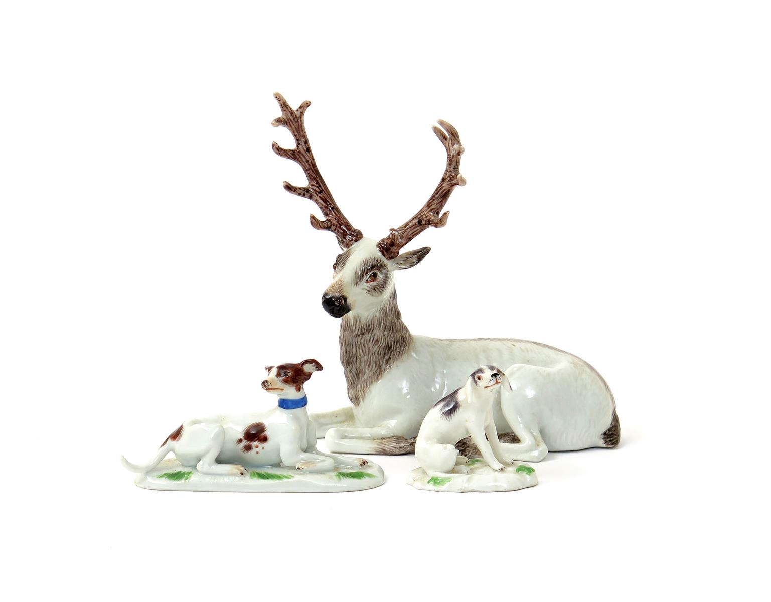 A small Meissen model of a stag and two miniature models of dogs 19th/20th century
