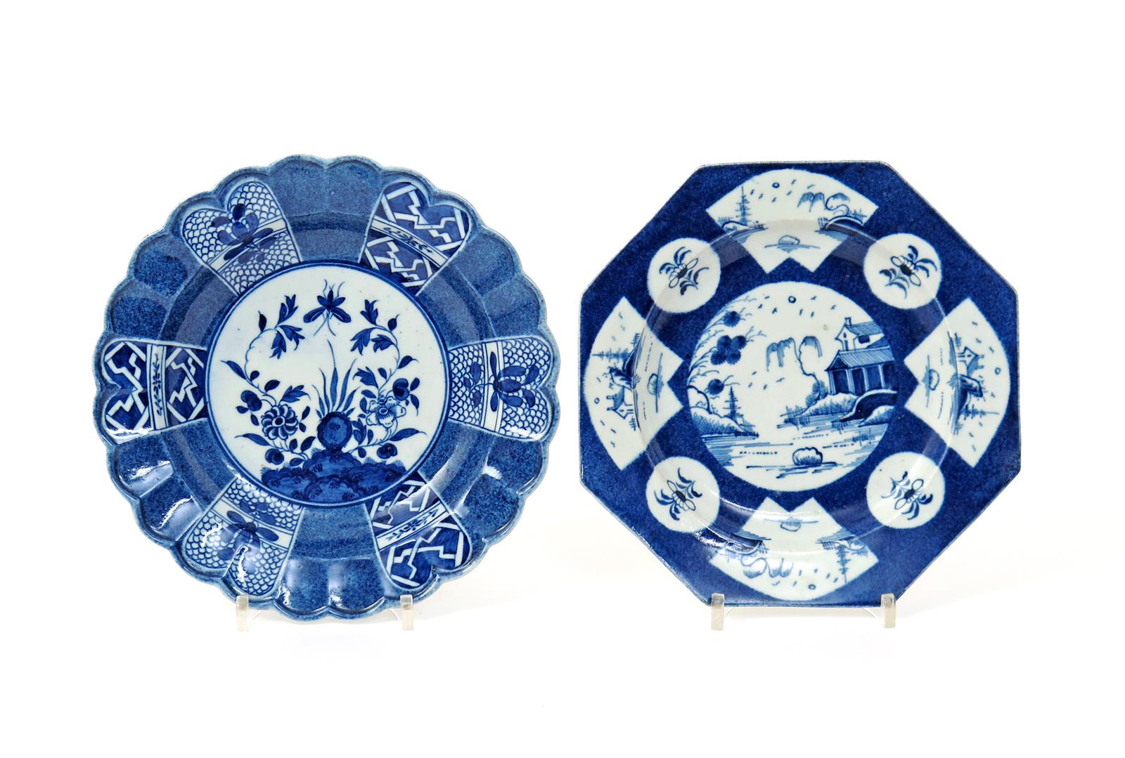 Two Worcester blue and white plates c.1765-68, one octagonal and painted with the Fan-Panelled Landscape pattern of Oriental landscapes reserved on a powder blue ground, the other with a scallop-edged rim and painted with peony and chrysanthemum branches to the well, the rim with six panels of flowers on a scale or cracked ice ground, alternating with powder blue panels, pseudo script marks, 20.6cm max. (2)