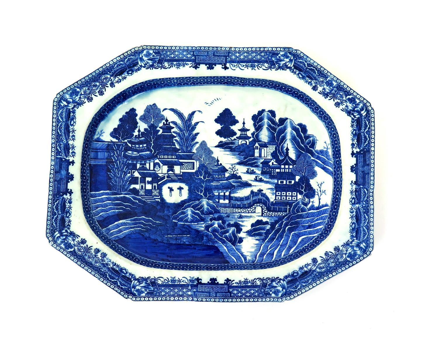 A massive Caughley blue and white charger or meat dish c.1775-85, printed with the Nanking pattern of figures in an extensive pagoda landscape, the cavetto with a cell diaper band, the rim with a Fitzhugh border, printed S mark, 57cm.