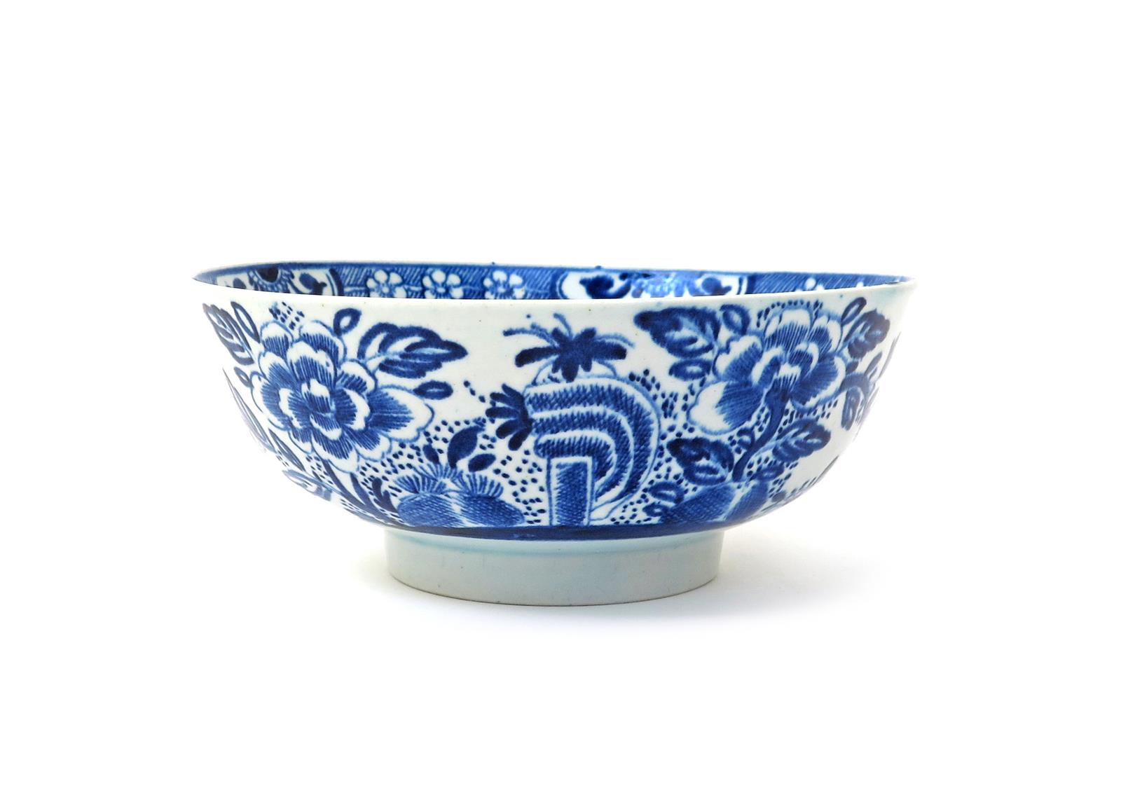 An Isleworth blue and white bowl c.1770, painted with peony blooms issuing from rockwork, the interior with a single peony bloom to the well, the rim with four shaped panels linked by a band of flowerheads on a hatched ground, 20cm dia.