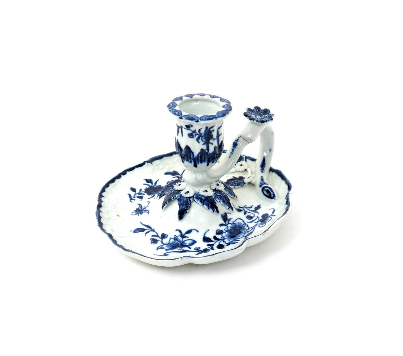 A rare Derby blue and white chamberstick c.1760, the shaped circular base lightly moulded with foliate scrolls and applied with flowers and leaves, the sconce rising from a twig handle, all painted with Oriental flower sprays, some good restoration to the sconce, 7.5cm high.