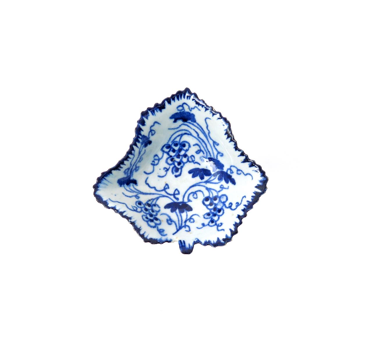 A Lowestoft blue and white pickle dish c.1770, the small leaf shape painted with a large spray of fruiting grapevine within a blue feathered rim, moulded with leaf veins to the underside, 8cm.