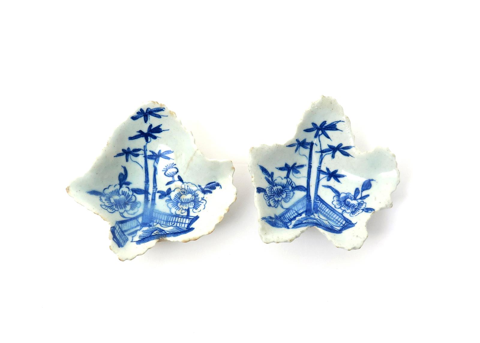 A rare pair of Bow blue and white pickle dishes c.1755-58, of early leaf shape, painted with peony blooms either side of tall bamboo stems before a zigzag fence, the underside moulded with veins, blue 41 inside each footrim, the handles lacking, small faults, 7.5cm. (2)