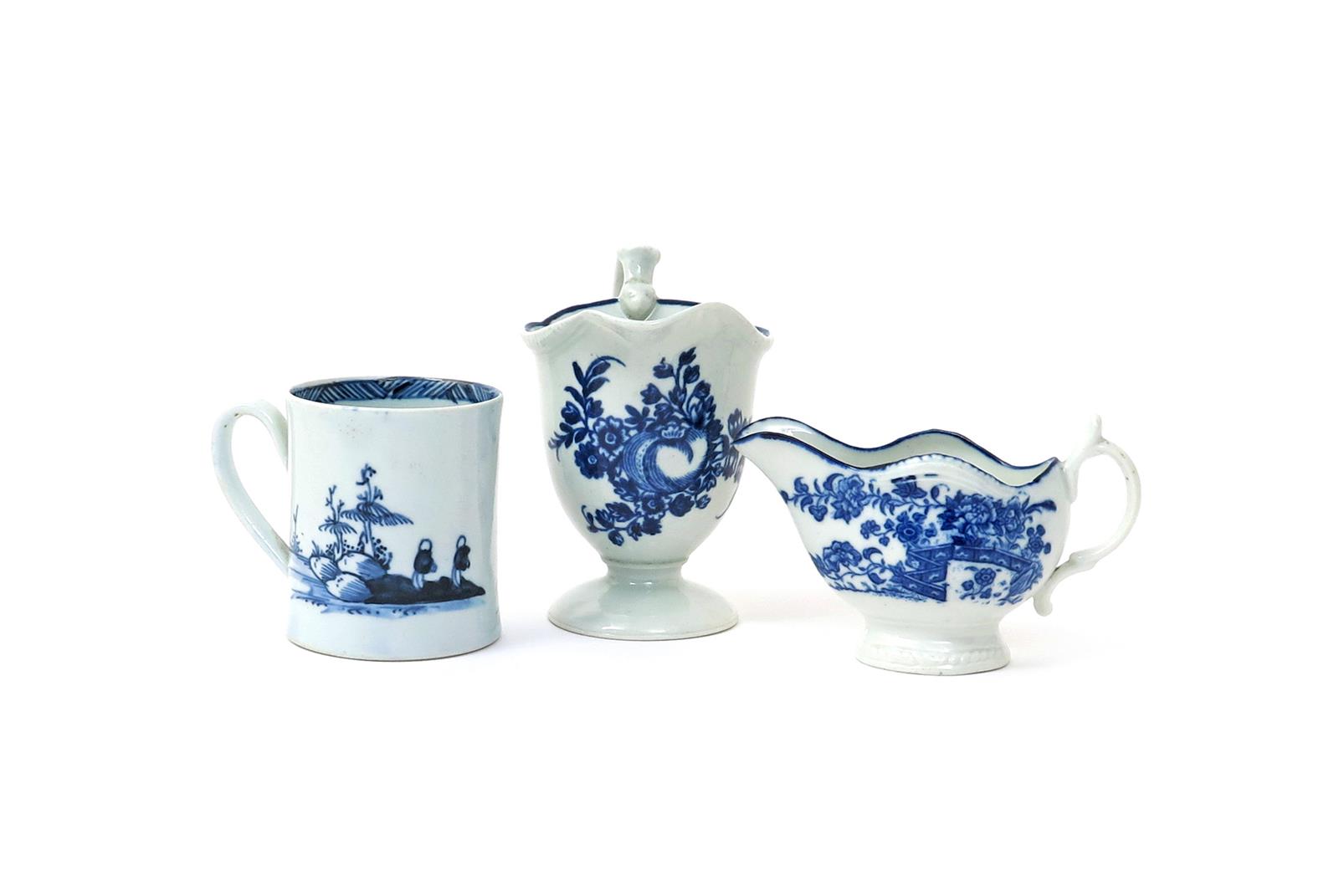 A Richard Chaffers (Liverpool) blue and white coffee can c.1758, the tall cylindrical form painted with two Chinese figures standing beside trees issuing from rocks, the reverse with a pagoda beside a weeping willow, a Pennington milk jug printed with fruit sprays, and a Worcester creamer printed with the Fence pattern, hatched crescent mark to the latter, 9.5cm max. (3)