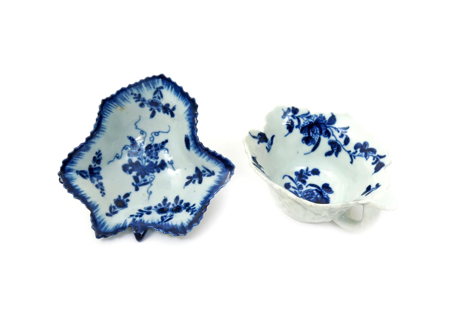 A Worcester blue and white pickle dish and a butterboat c.1760, the former painted in the Pickle Leaf Vine pattern, the butterboat formed of moulded geranium leaves and painted with the Butterboat Mansfield pattern, workman's marks, 9cm max. (2)