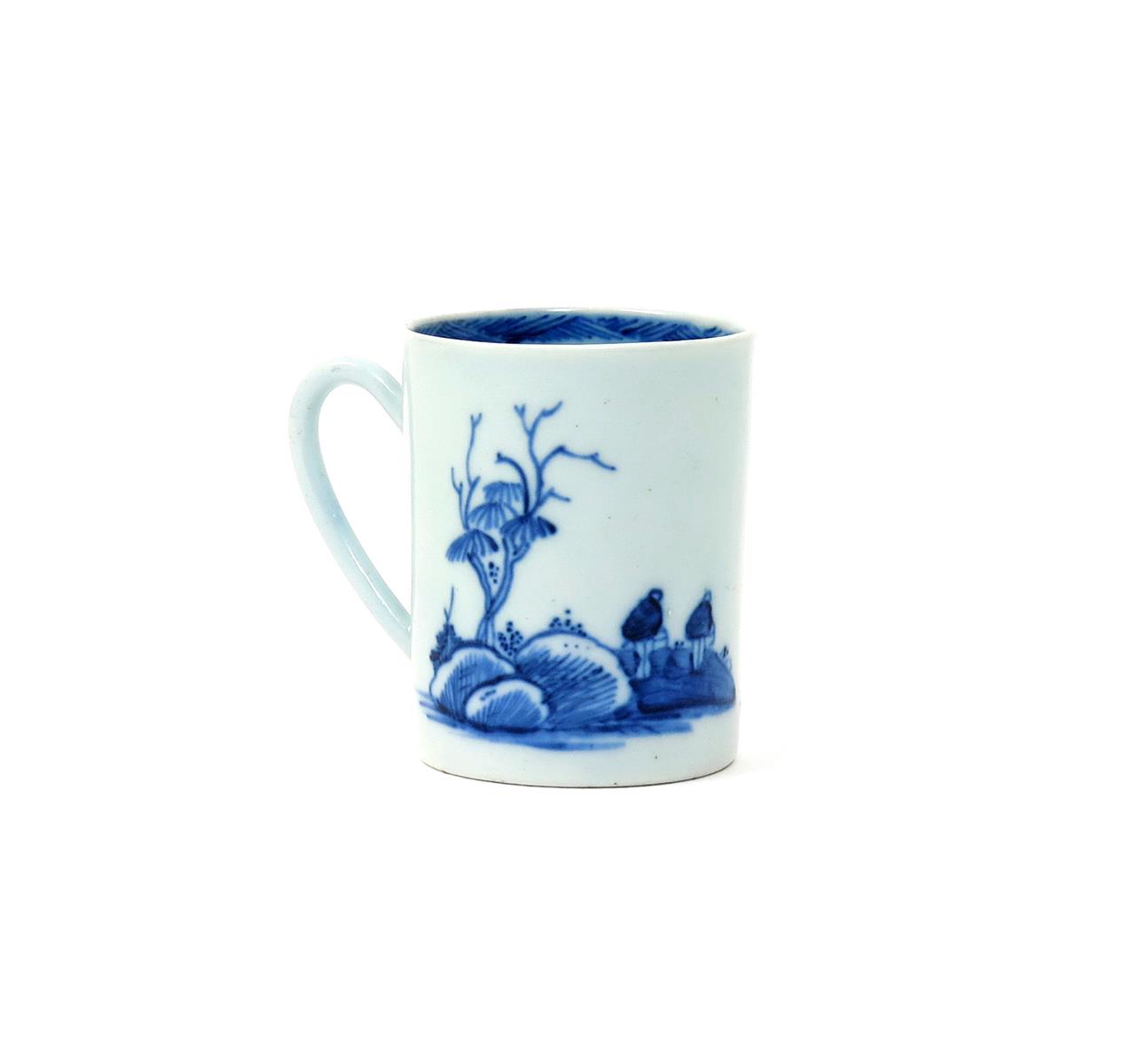 A Richard Chaffers (Liverpool) small mug or coffee can c.1758-60, the narrow cylindrical form painted with two figures in a Chinese landscape beside rocks and bare trees, the reverse with a tall pagoda in a similar setting, the interior rim with a hatched border, 6cm.