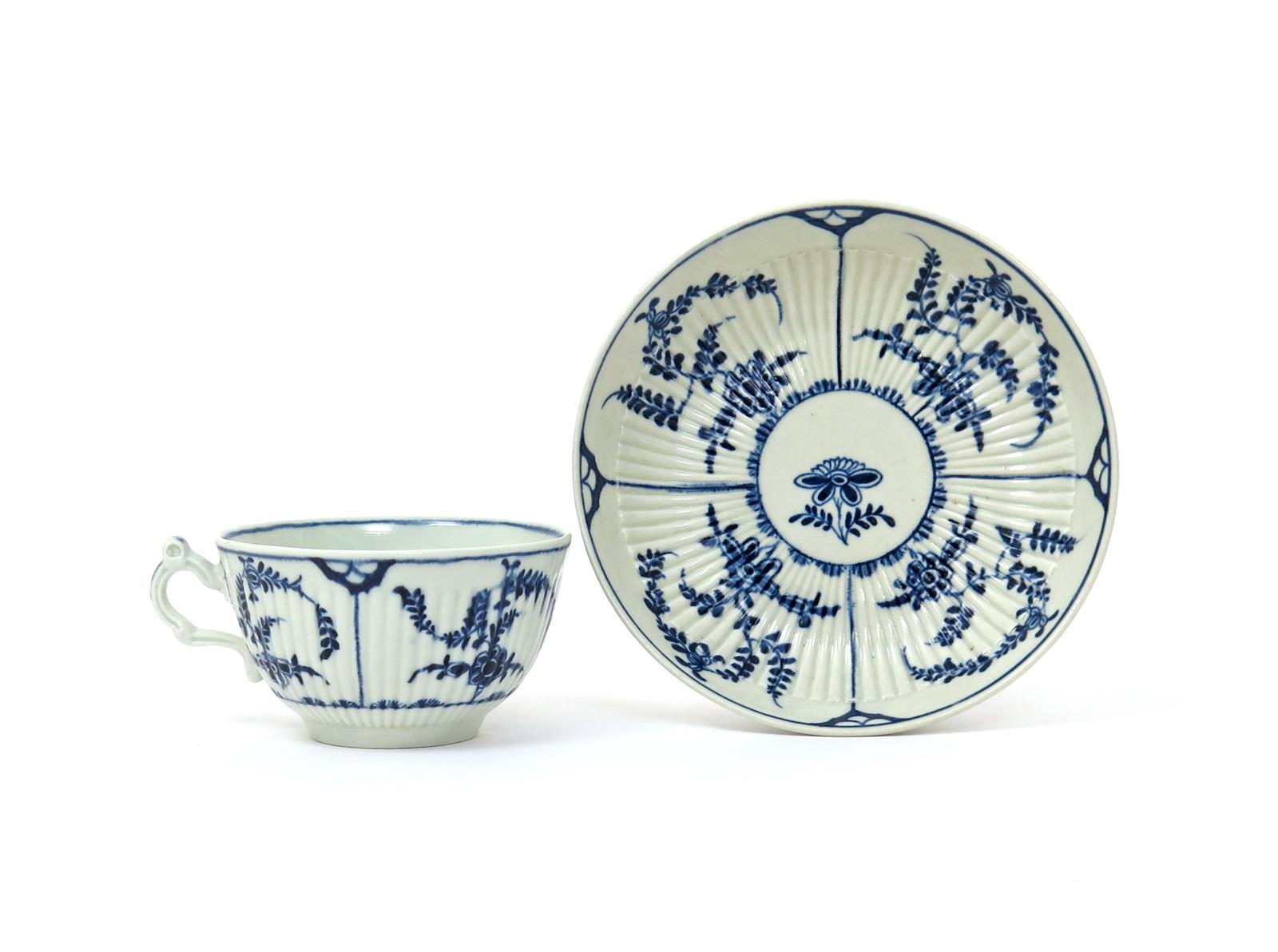 A Worcester blue and white teacup and saucer c.1770, of generous reeded form, painted with the Immortelles pattern of sprawling floral tendrils, the cup with a finely moulded scroll handle, open crescent mark, 13.7cm. (2)