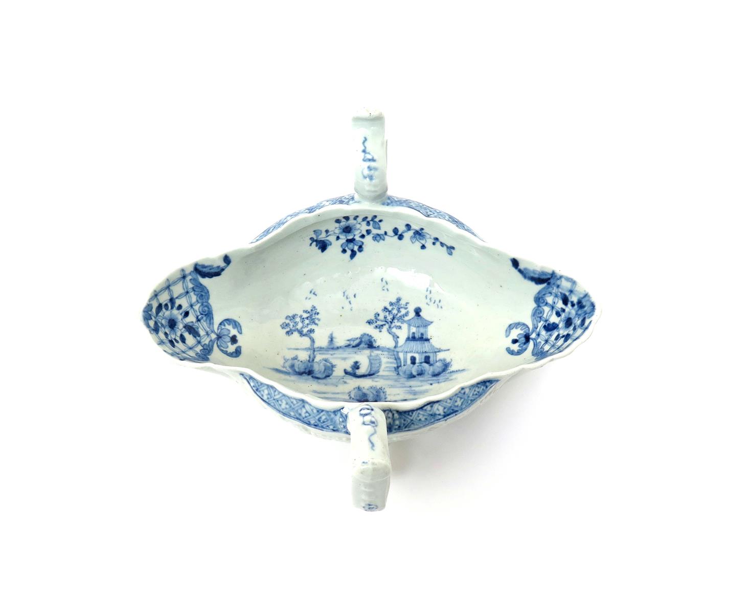 A Worcester blue and white two-handled sauceboat c.1756, painted with the Two-Handled Sauceboat pattern, the interior with a fisherman beside a two-storey pagoda, the moulded exterior with four small vignettes of further figures, birds and flowers, workman's mark, 19cm.