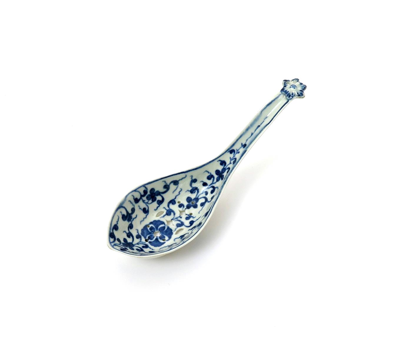 A good Worcester blue and white rice spoon c.1768, painted with the Maltese Cross Flower pattern and pierced to the base of the bowl, the handle with a flower terminal, 14.2cm.