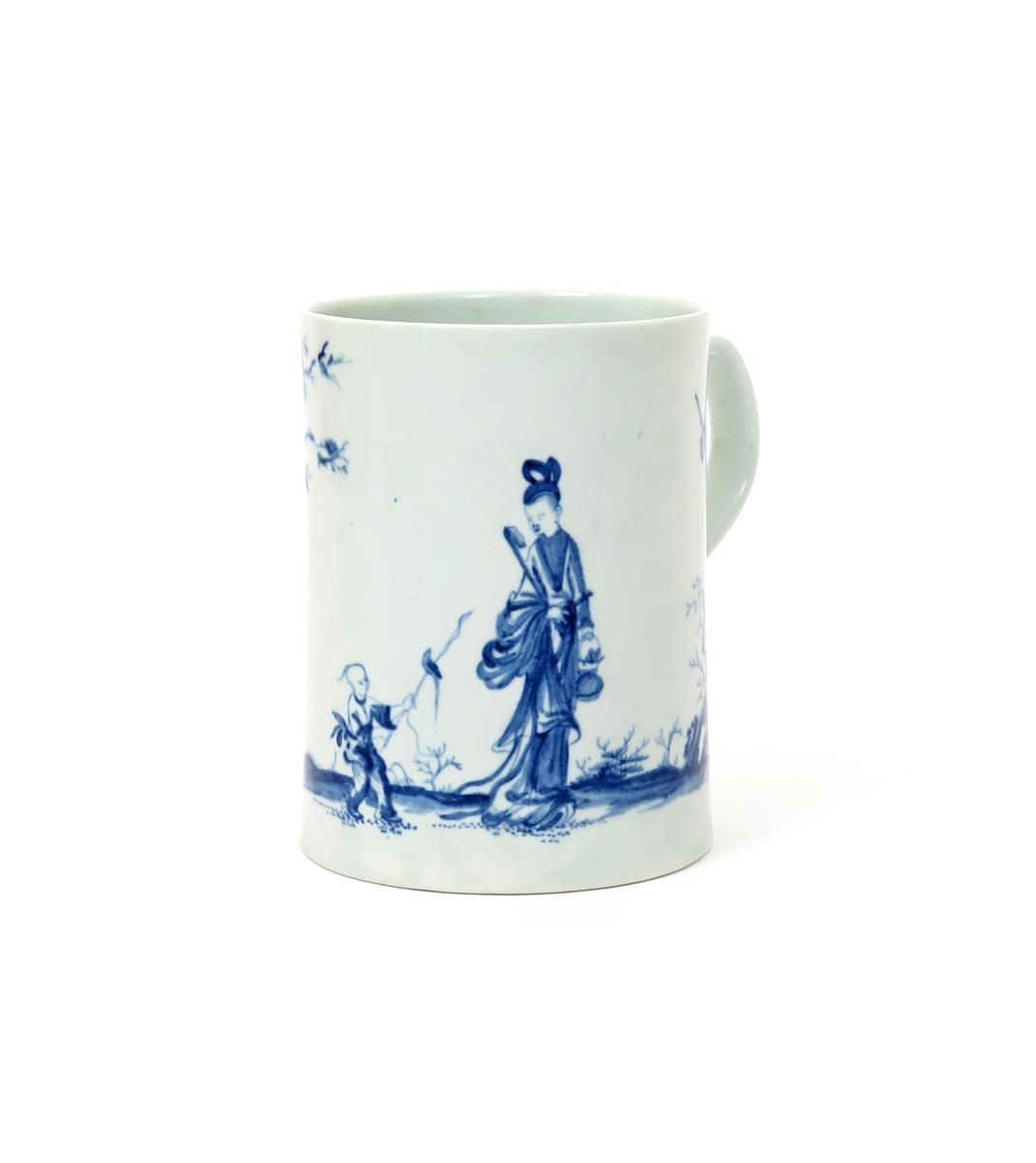 A large Worcester blue and white mug c.1756, the slightly waisted form painted with the Walk in the Garden pattern, with birds perched on a gnarled tree above a boy with a further bird on a long stick and a lady holding a ruyi sceptre, workman's mark, a small filled rim chip, 14cm.