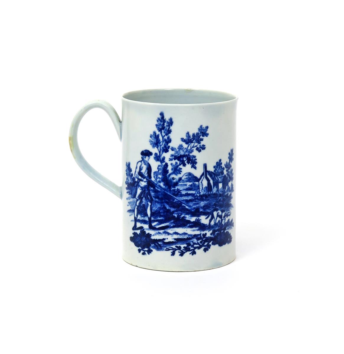 A rare Worcester cylindrical blue and white mug c.1775-85, printed with Man Holding a Gun and Man Shooting a Gun, each hunter in a rural landscape and accompanied by a hound, fluted strap handle, hatched crescent mark, a restored rim chip and a small restored chip to the handle, 12cm.