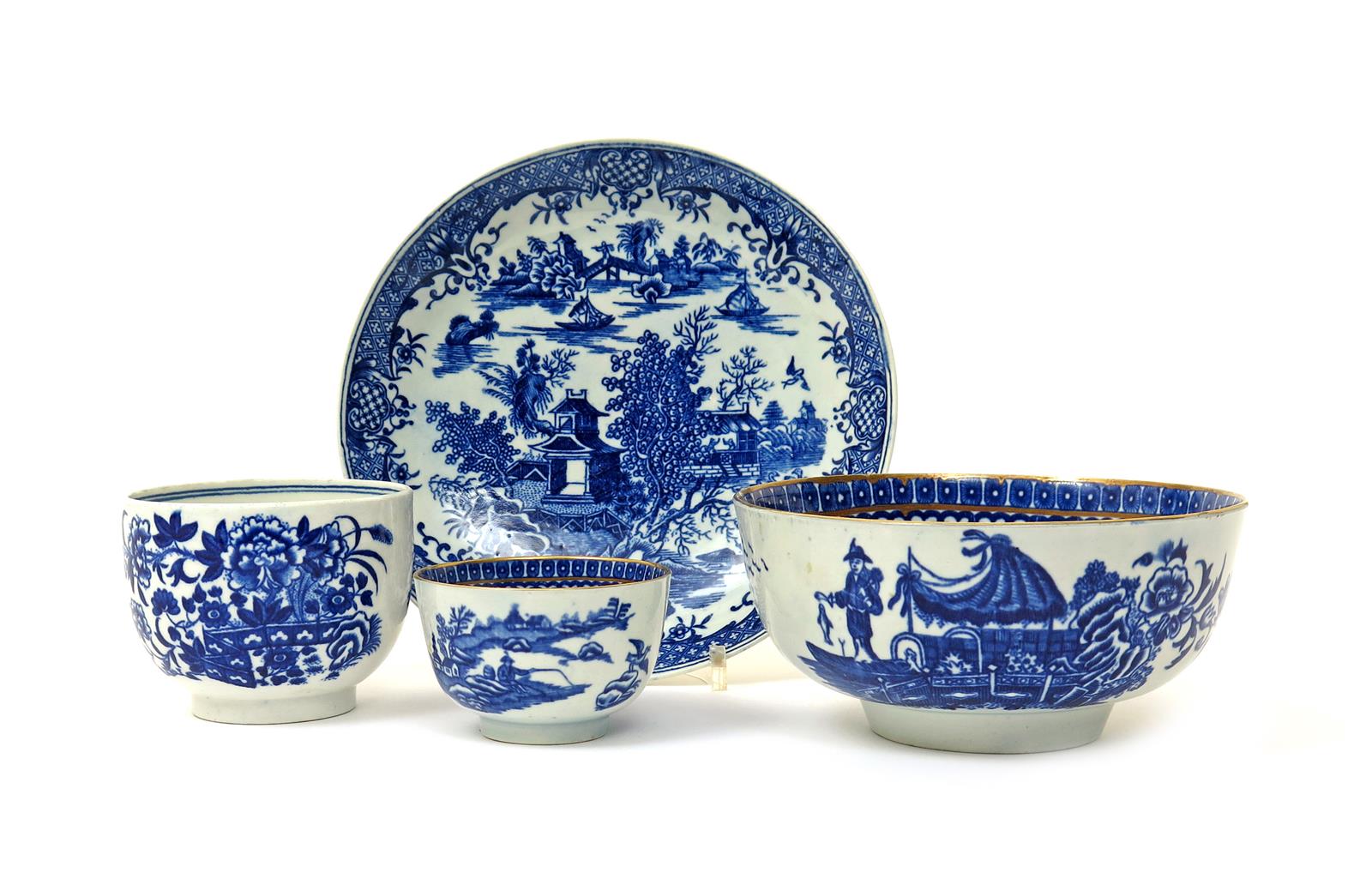 A Worcester blue and white saucer dish c.1780, printed with the Argument pattern, disguised numeral mark, a slop bowl and a teabowl printed with the Fisherman and Cormorant pattern and with gilded bands to the rims, and a sugar bowl printed with the Fence pattern, hatched crescent marks, 18.5cm max. (4)