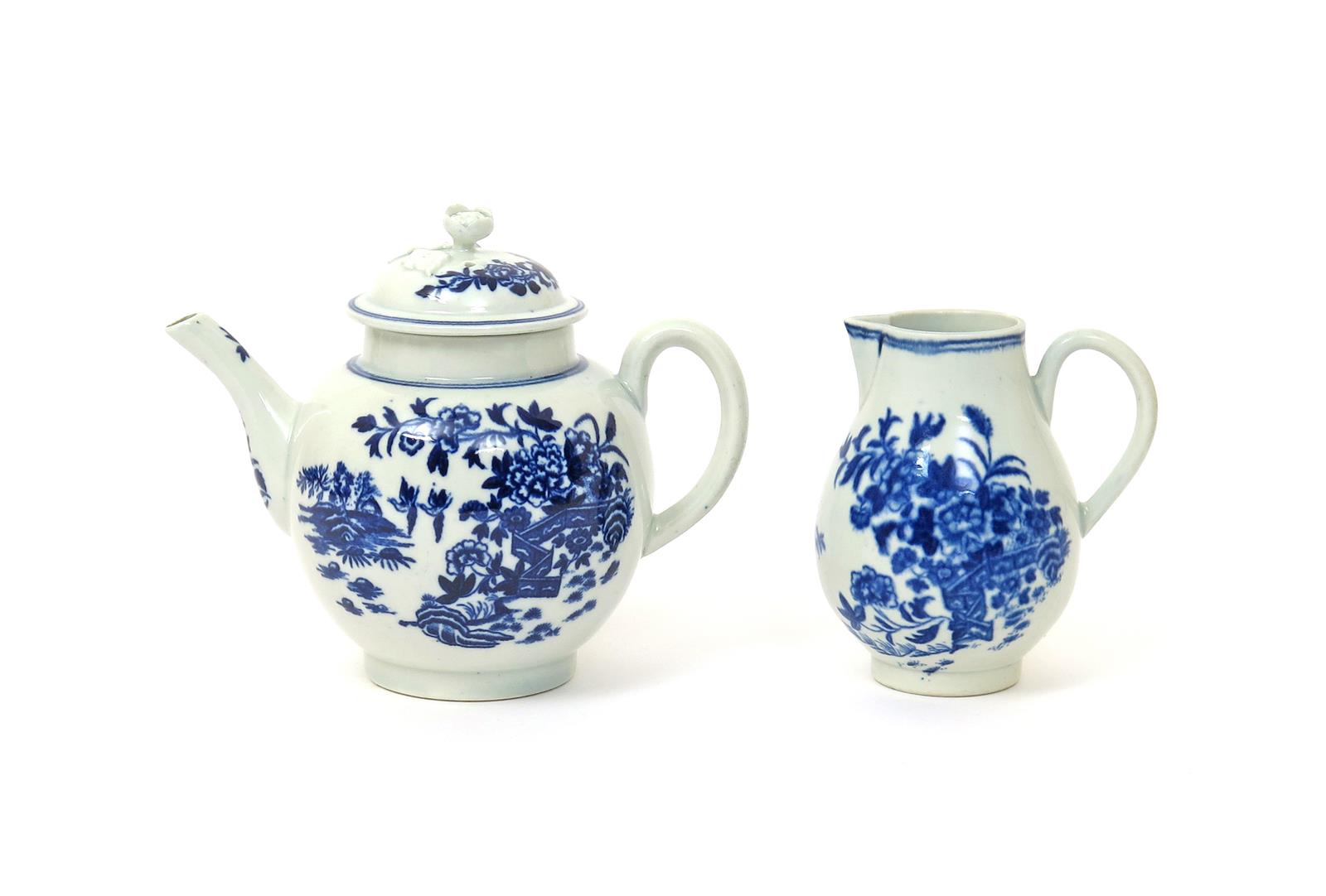 A Worcester blue and white teapot and cover c.1770-75, and a large milk jug, both printed with the Fence pattern, a zig-zag ornamental fence amidst flowering peony branches, hatched crescent marks, a small body crack to the teapot, 16.8cm max. (3)