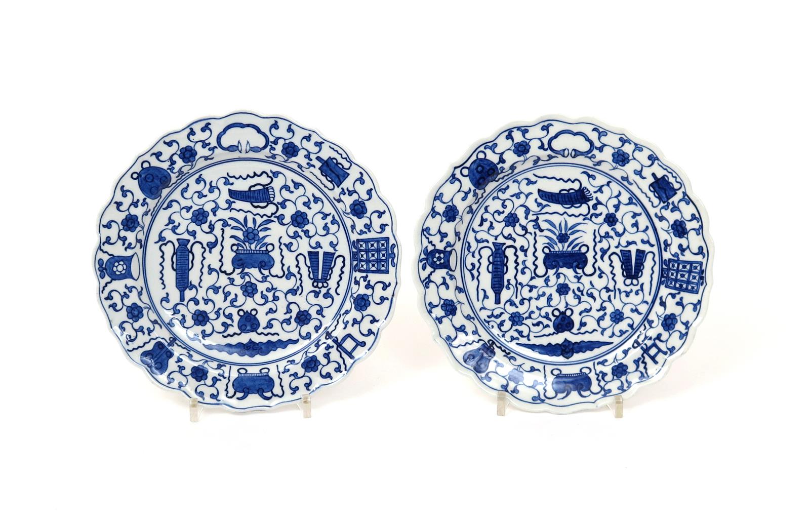 A pair of Worcester blue and white dessert plates c.1770-80, painted with the Hundred Antiques pattern, with central censers and other Chinese auspicious objects amidst continuous floral scrolls, the design echoed to the shaped rims, pseudo Chinese script marks, a 4mm rim chip to one, 19.3cm. (2)