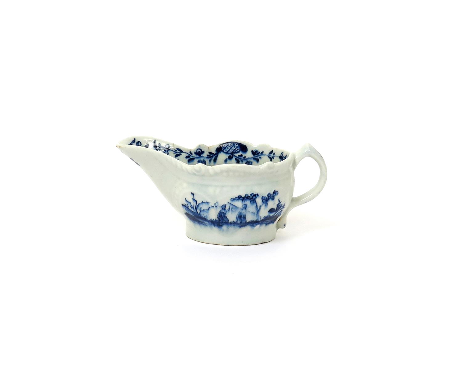 A Lowestoft blue and white creamboat c.1775, moulded with arcaded panels and painted with the Two Porter Landscape pattern, the interior with a peony spray and foliate border, 11cm across.