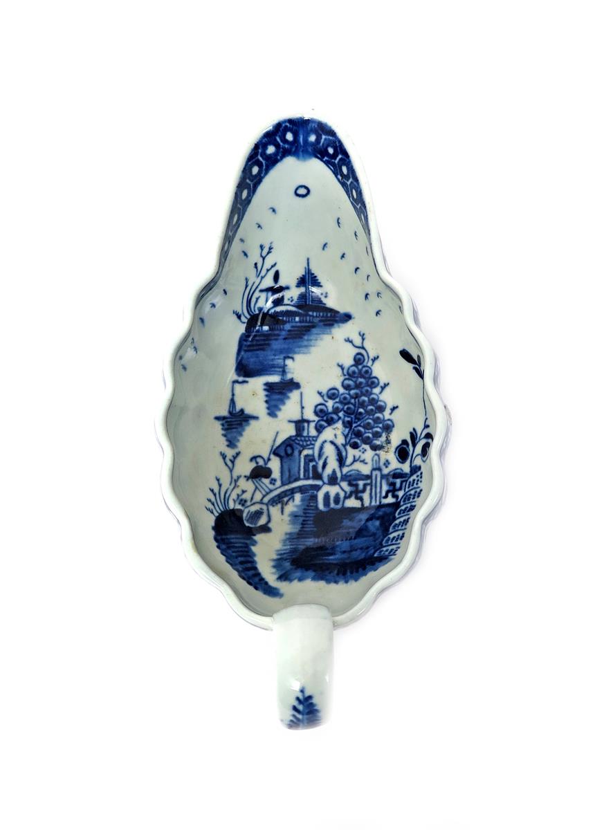 A Worcester blue and white sauceboat c.1775, of shallow fluted form, painted to the interior with the Full Moon pattern beneath a cell diaper border, the exterior with floral sprigs and a formal border, 20cm.
