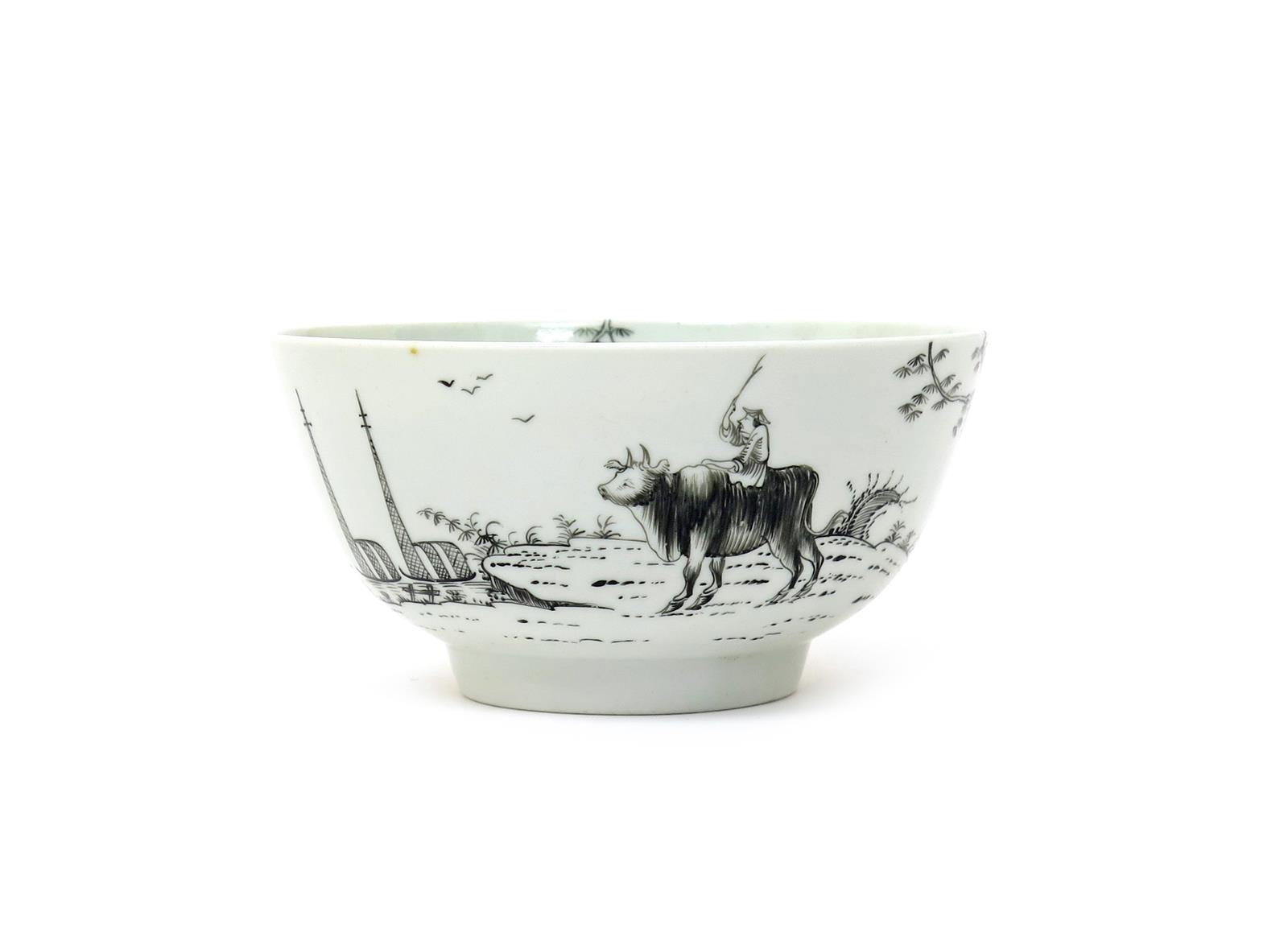 A Worcester small bowl c.1755-58, pencilled in black with the Boy on a Buffalo pattern, the eponymous pair depicted in a continuous Chinese landscape with two junks on a river, the interior with bamboo tendrils, a bird in flight and a central flower spray, a short scratch mark to the base, 12.2cm dia.