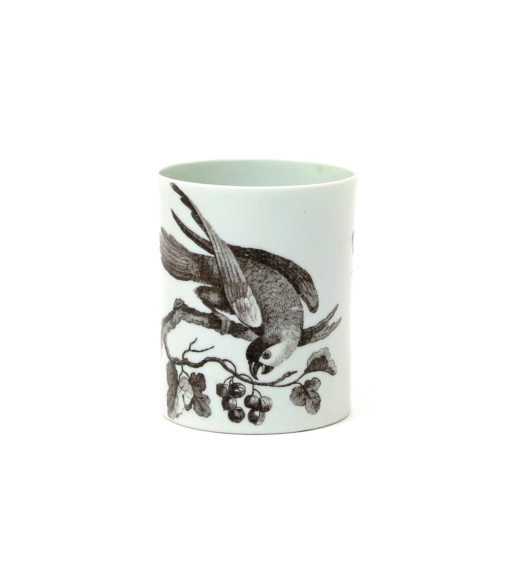 A good Worcester small mug c.1758, printed in black with the parrot Pecking Fruit pattern, a large bird bending his beak towards grapes suspended beneath the branch on which he perches, between two large butterflies, a small restored rim chip, 8.3cm.