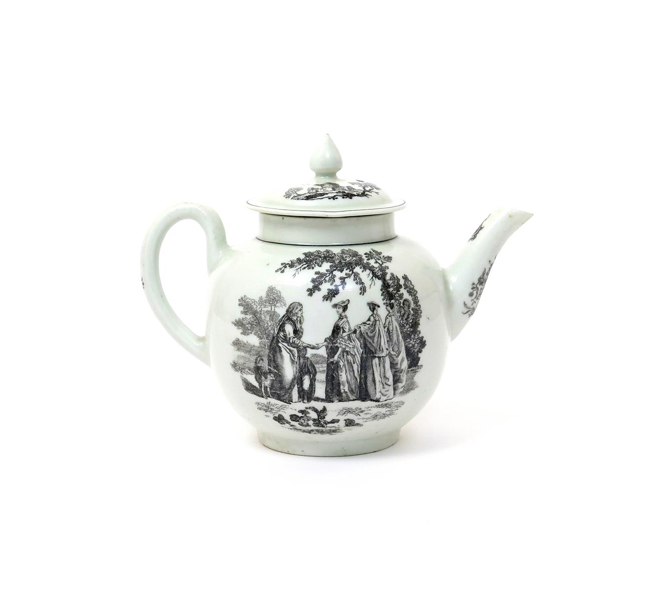 A Worcester teapot and cover c.1768, printed in black with The Fortune Teller to one side, three maidens encountering a palm reader with a child and dog, the reverse with Tea Party No. 2, the cover with vignettes of Ruined Tower and a Windmill, a small footrim chip, 18.5cm. (2)