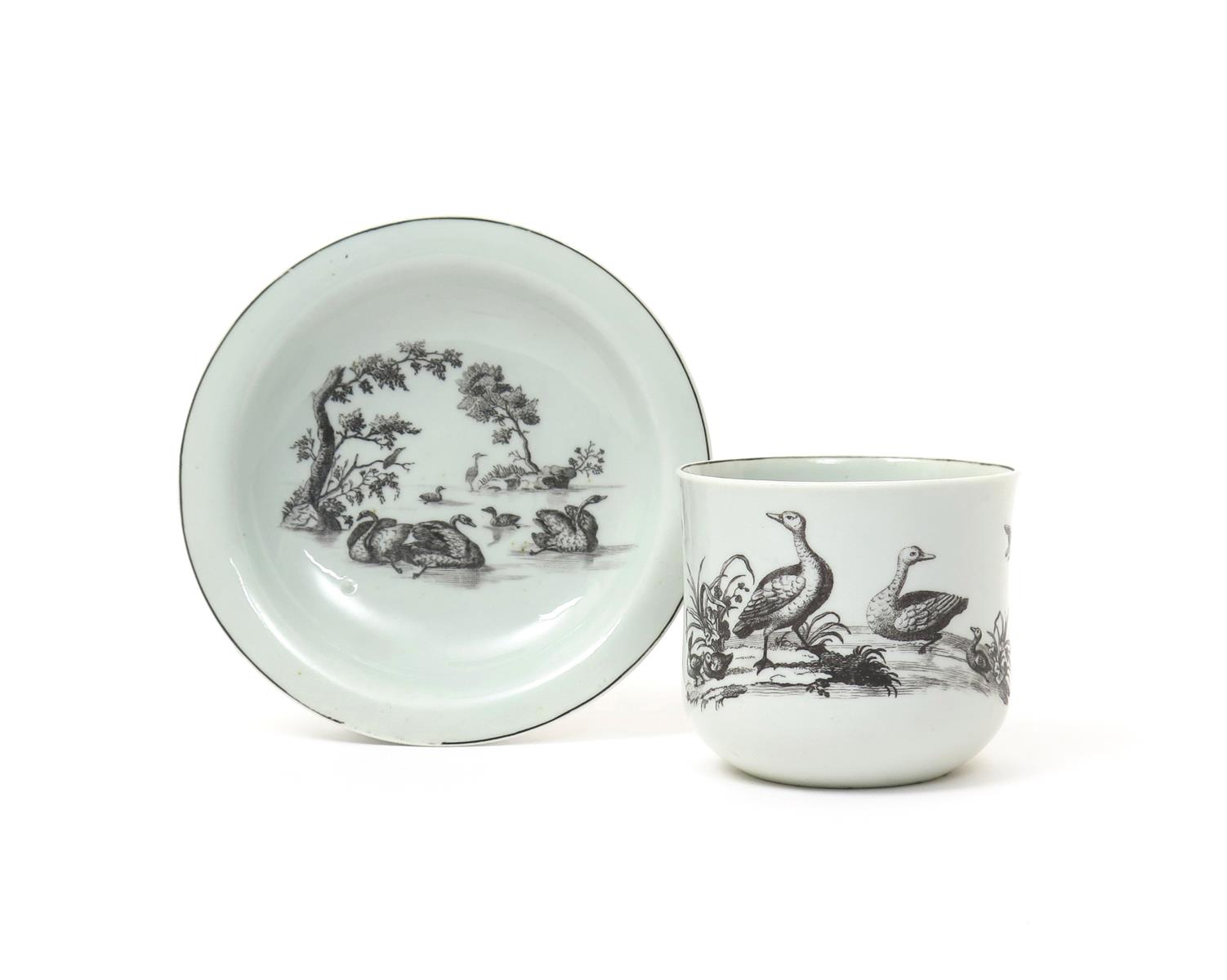 A rare Worcester finger bowl and stand c.1758, printed in black with the River Scene print, with mallard ducks to the bowl, the stand with swans swimming before a kingfisher on a low branch and a standing heron in the distance, a little wear to the black line rim, 14.7cm. (2)