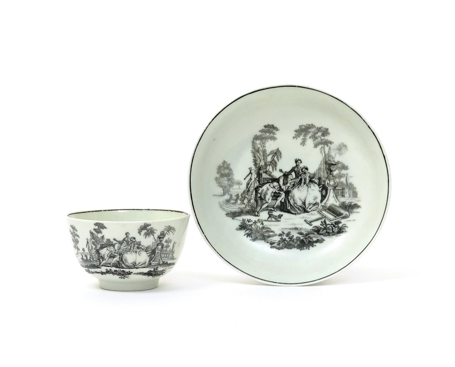 A Worcester teabowl and saucer c.1765, printed in black with L'Amour, a courting couple on a garden bench with a maid chaperoning behind, the well of the teabowl with a single swimming swan, 12.1cm. (2)