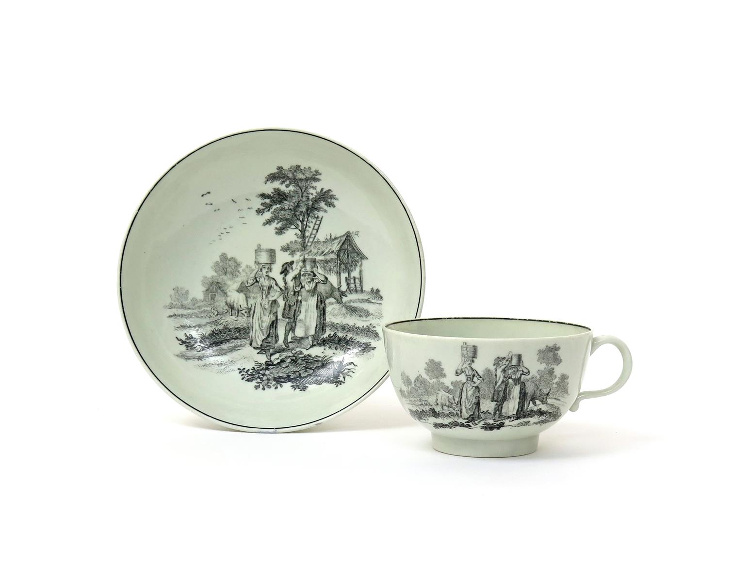 A Worcester teacup and saucer c.1765, printed in black with The Milkmaids, a farmhand helping two maids to balance pails of milk on their heads, blue crossed swords and 9 mark, 13.2cm. (2)