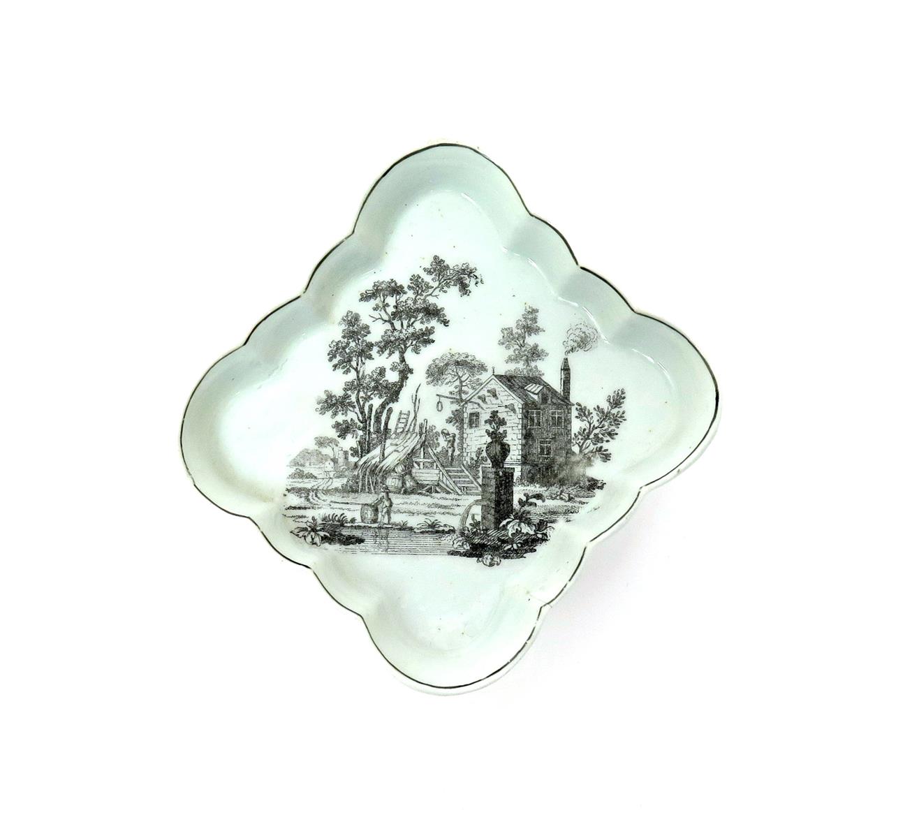 This unusual quatrefoil form of spoon tray appears to be particular to the printed wares. Other versions with the same design are known but often include a further tree on the left hand side.