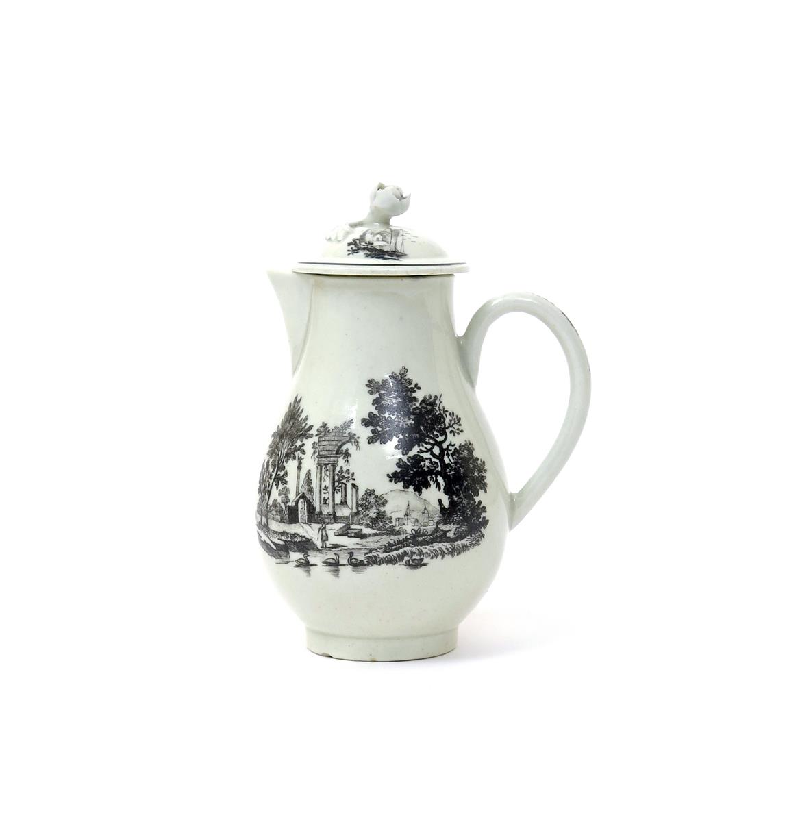 A Worcester small jug and cover c.1765, printed in black with scenes of Classical ruins, one side with a figure and ducks on a lake before a partial arch and a column beneath trees, the reverse with two figures surveying an obelisk amidst other colonnaded ruins, a floral knop to the cover, a large chip to the cover's edge, 13.5cm. (2)