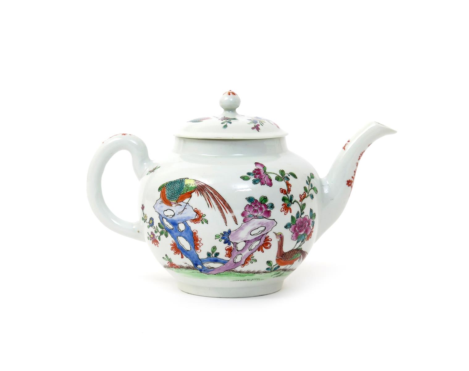 A rare Worcester teapot and cover c.1753-54, decorated in the famille rose palette with long-tailed pheasants perched on and beneath holey rockwork beside flowering peony branches, the flowers echoed to the cover and spout, spoiled red anchor mark, a little restoration to the spout and cover, 20.5cm. (2)