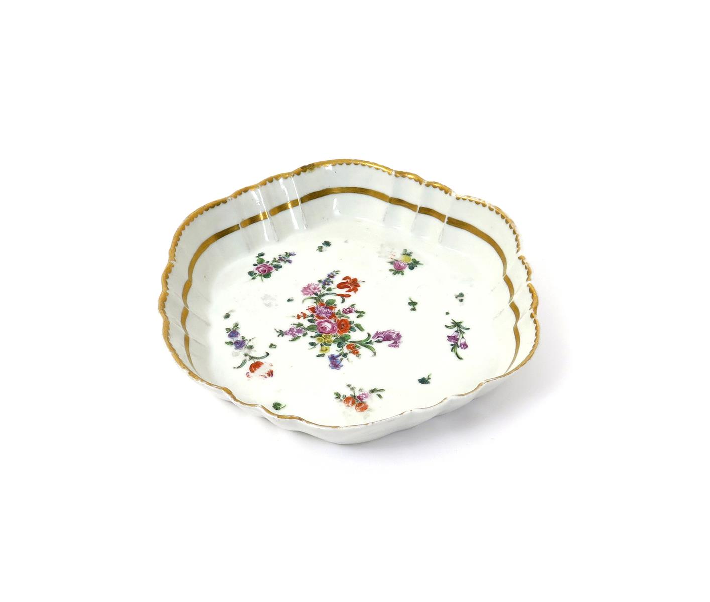 A Champion's Bristol teapot stand c.1775, the hexagonal form of generous size and painted in polychrome enamels with a spray of flowers within single scattered blooms, the inside rim with a narrow gilt band beneath the gilt dentil border, 16cm.