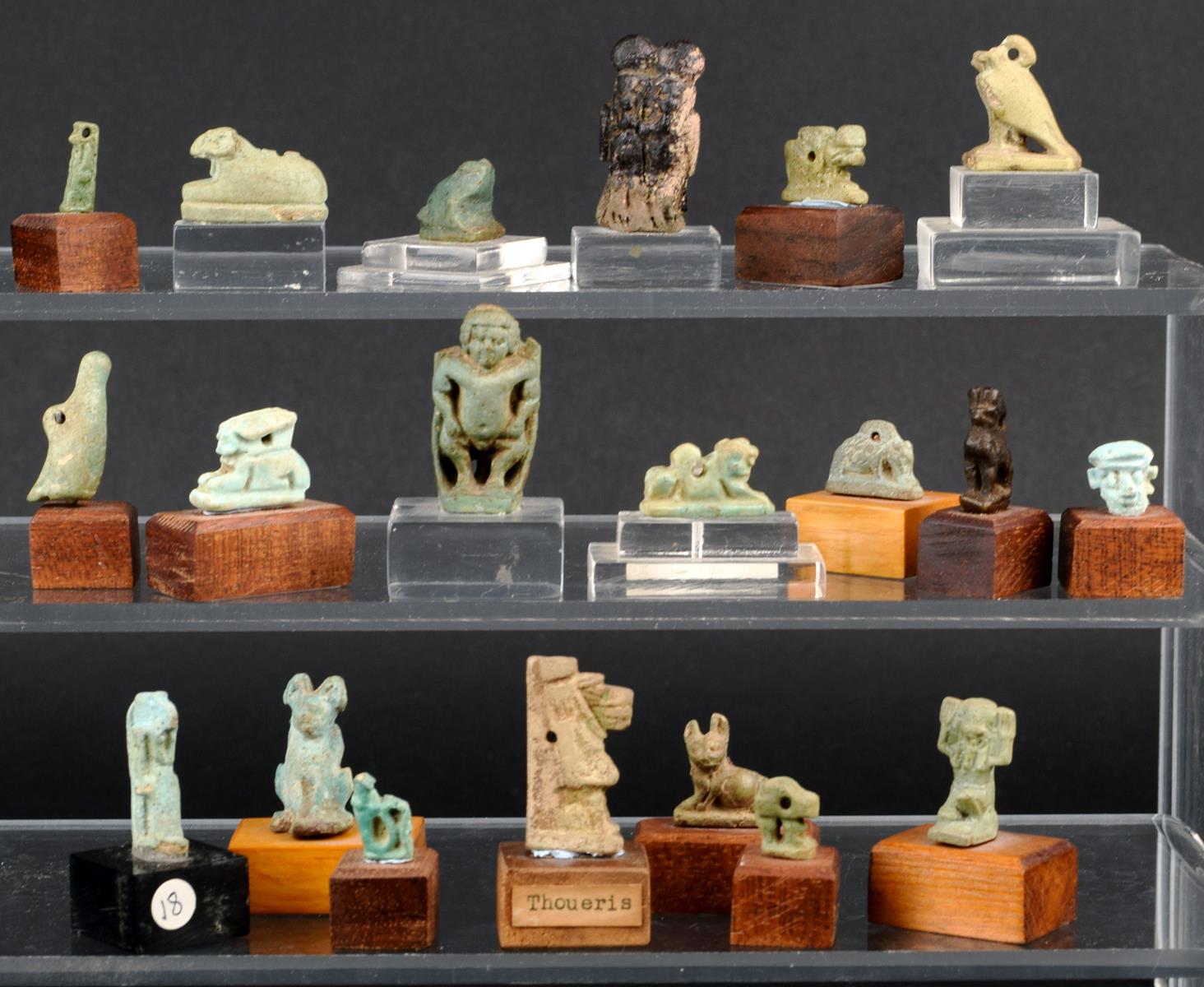 including a hare, a ram, three cats, a frog, a lion, a pig, Pataikos wearing a cropped wig and with a winged deity to the reverse, a double falcon body with sun discs, Thoeris, a falcon, a kneeling Shu with arms raised, a crown, two striding amulets, a head and three others,